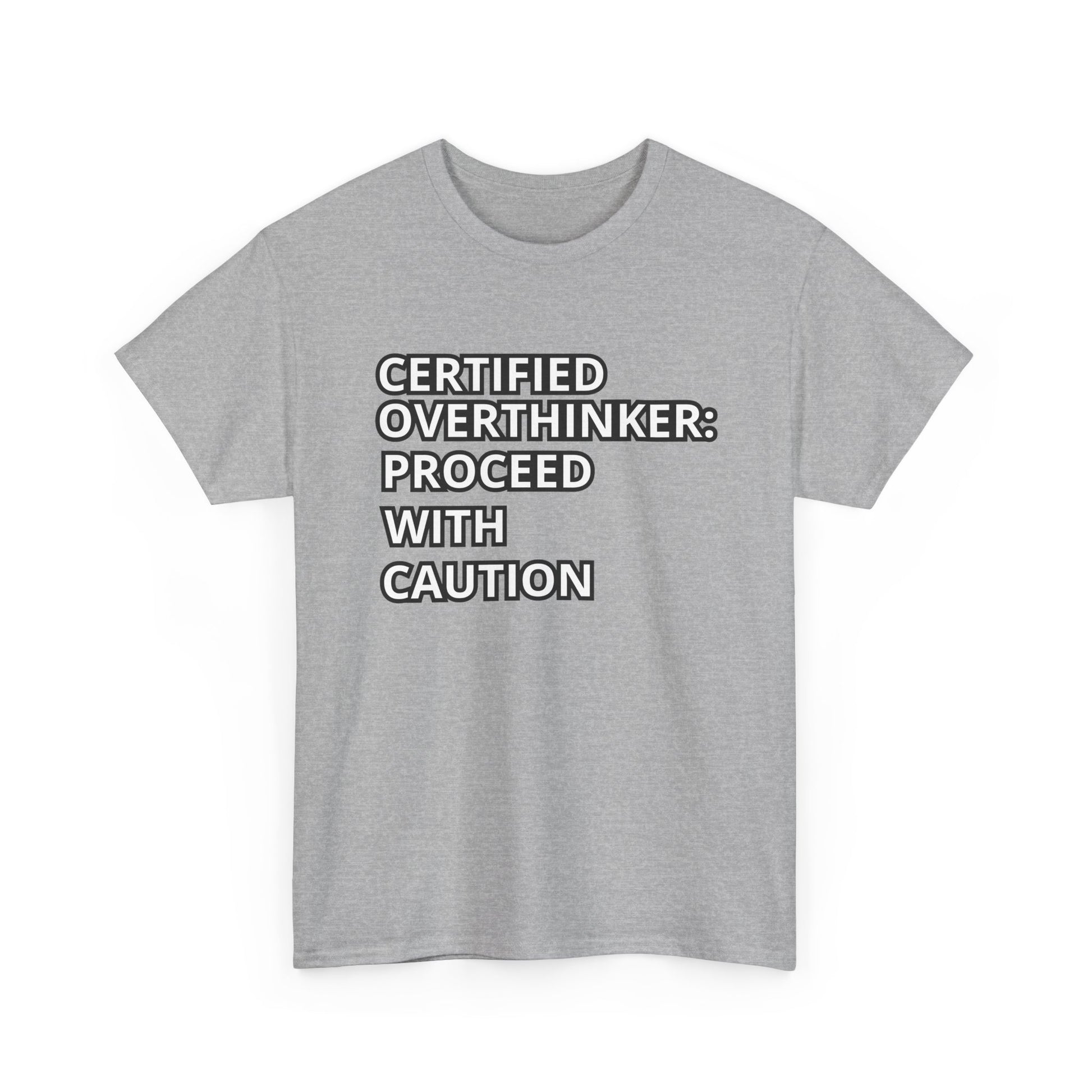 Show off your humor and personality with this Unisex Heavy Cotton Tee – "CERTIFIED OVERTHINKER: PROCEED WITH CAUTION". Perfect for overthinkers, witty individuals, and anyone who loves clever slogans, this playful t-shirt adds a light-hearted touch to any casual or semi-formal outfit. Its humorous design makes it a fun conversation starter at meet-ups, casual outings, or while lounging at home.